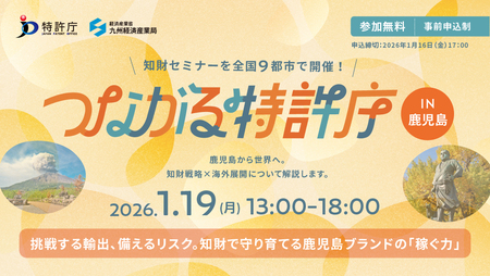 令和7年度第7回目となる「つながる特許庁 in 鹿児島」では、セッション①【講演】日系企業の新興国への海外進出と国際ビジネスに潜む様々なリスク なぜ新興国では知財保護が重要なのか? セッション②【講演】1.地域企業から世界へ―学びを戦略に変える海外展開の実践 2.鹿児島の焼酎を世界へ ─ 挑戦する輸出と備えるリスク セッション③【パネルディスカッション】海外で稼ぐ九州企業の知的財産活動 をテーマに、企業の取組について情報発信します。