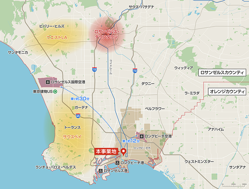 本物件が立地するロングビーチ市は、ロサンゼルス都市圏の南部に位置し、交通利便性と生活の快適性を兼ね備えた都市です。本物件は、主要高速道路710号線・405号線に近接し、ロサンゼルス国際空港へは車で約30分、国内線の拠点であるロングビーチ空港へは約12分でアクセスが可能です。さらに、本物件徒歩約3分の5th St駅よりロサンゼルス市中心部へは鉄道(ライトレール)が直通し、ロサンゼルス市中心部や周辺都市へもスムーズに移動することができます。また、オレンジカウンティ、サウスベイの産業エリアなど雇用集積地へのアクセス性も高いエリアです。