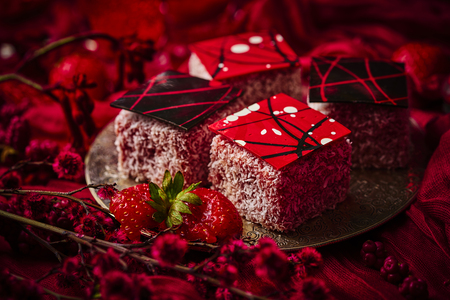 いちごチョコを練り込んだ生地に甘酸っぱいいちごジャムを重ね、艶めく深紅のチョコでコーティングした二段仕立てのザッハトルテ『もどれると思った?』は、凛とした美しさと飽きのこない甘美さから、思わず引き返せなくなる“中毒性”を秘めた一品です。『狂いなさい』は、スポンジケーキといちごを重ねたショートケーキを竹炭入りクリームで包み込み、表面を丸ごとのいちごで隙間なく覆うことで狂気的なヴィジュアルを表現しました。『止めても無駄よ』は、スポンジにいちごチョコシロップをたっぷり染み込ませ、ココナッツで包み込んだしっとり食感のラミントン。軽やかでありながらクセになる、何度でも手が伸びる魅惑の味わいに仕上げました。