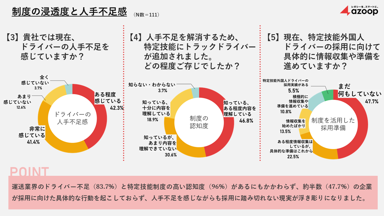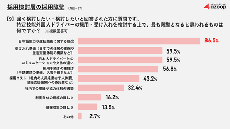株式会社 Azoop(本社:東京都港区、代表取締役社長 CEO: 朴 貴頌、以下「Azoop」)は、2024年12月に開始した特定技能外国人ドライバー制度について、運送従事者111名を対象に実態調査アンケートを実施しました。その結果、運送会社の人手不足感(83.7%)と制度の認知度(96.3%)が高いにもかかわらず、6割以上(64.8%)が特定技能外国人ドライバーの採用に消極的でした。また、運行の安全性、日本人ドライバーとのコミュニケーションや文化の違いが懸念であり、採用検討層・消極層ともに行政や支援機関に費用・教育・トラブル発生時の支援を求めていることも明らかになりました。