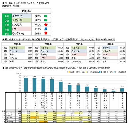 2025年に食べる機会が多かった野菜の1位「キャベツ(52.5%)」、2位「たまねぎ(48.5%)」は昨年と変わらず、4位「トマト(41.5%)」とともに2022年から4年連続でトップ5にランクインとなっています。