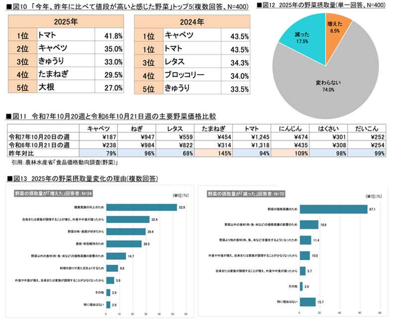 2025年の野菜摂取量では、「増えた(8.5%)」「変わらない(74.0%)」「減った(17.5%)」と、増えた人より減った人の方が2倍程度多くなっており、「減った」回答者の理由は「野菜価格高騰のため(67.1%)」が極めて高い割合で1位となっています。