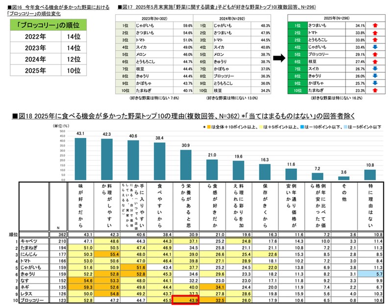 また、5月末に実施した「野菜に関する調査」では、「子どもが好きな野菜トップ10」において、2023年はランク外であった「ブロッコリー」が、2024年8位、2025年5位と順位を伸ばしており、大人だけなく子どもにおいても「ブロッコリー」の人気が高まっていることがわかります。