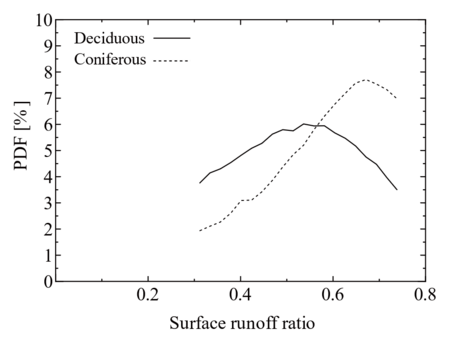 図2 .線形混合モデルから推定した落葉広葉樹天然生林とスギ・ヒノキ人工林の表面流出率の確率分布の比較。