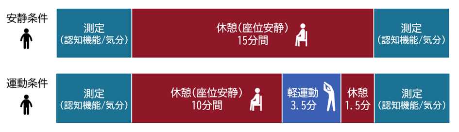 小学5年生から中学2年生の計31名を対象に実験を行いました。実験では、①安静条件(15分間を安静な座位で過ごす)と②運動条件(座位での休憩の合間に3.5分間の軽運動を行う)という2つの条件を、すべての対象者が実施しました。安静条件および運動条件の各前後に、認知機能と気分(快適度・覚醒度)の測定を行いました(図1)。