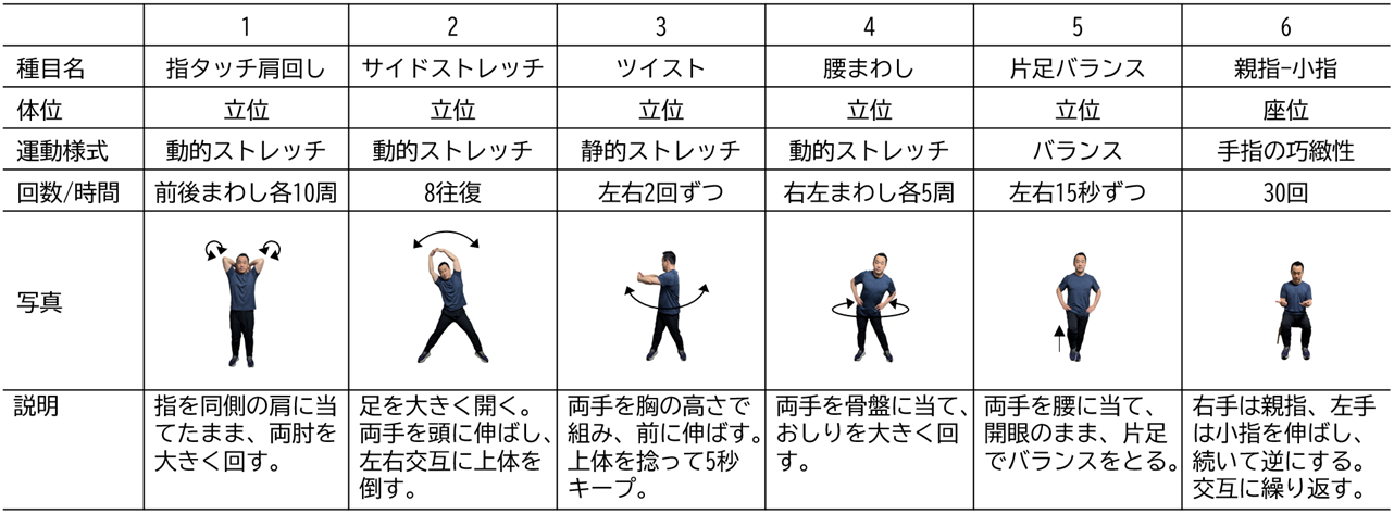 運動条件で用いた3分30秒の低強度運動プログラムは、ストレッチ・片足バランス・手指の運動など、誰もが取り組みやすい種目で構成されました。特別な道具や準備は不要で、その場でできる内容でした。この運動プログラムは、同研究グループが前頭前野(大脳の前方にある“脳の司令塔”と呼ばれる領域)の血流を増加させやすい低強度運動種目として、以前の研究(Naito et al., Scientific Reports, 2024)で特定した内容を元に作成されました(図2)。