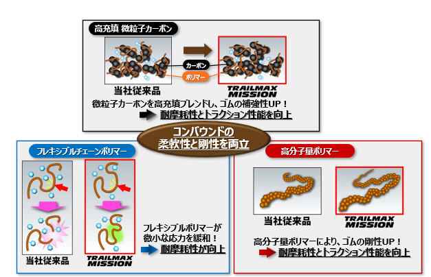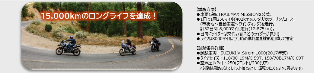 「TRAILMAX MISSION」はフロント・リア専用にブレンドしたフルカーボン配合を採用し、ロングツーリングにも耐えうるライフ性能とオフロードでのトラクション性能を強化しました。ライフ性能はすでに販売している米国でも評価は高く、※社内テスト値では15,000㎞を達成しました。