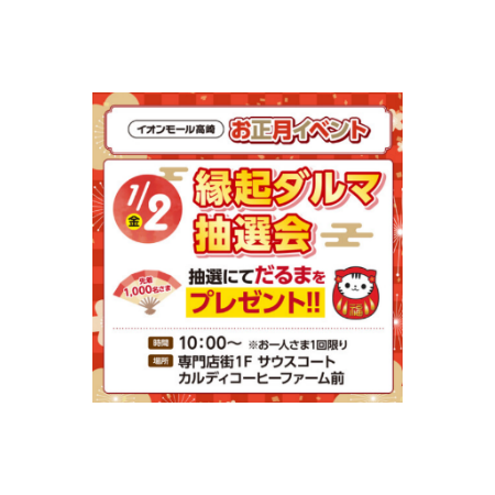 ・内 容:当日お買い上げのイオンスタイル高崎及びイオンモール高崎専門店夫々での1,000円(税込)以上のレシート(合算可)ご提示で参加できる抽選会です。当選時は群馬県ふるさと伝統工芸品の高崎だるまをプレゼント。