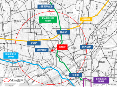 名神高速道路「豊中IC」 約5.4㎞ /「尼崎IC」約4㎞ 阪神高速11号池田線「加島料金所」約2.2㎞ JR東西線「加島」駅より 徒歩 約4分 |
