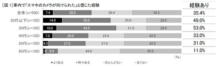 その結果、車内で「他人のスマホのカメラが自分に向けられているかもしれない」と感じた経験がある人は、全体の35.4%でした。また、20代以下は49.0%、30代は53.0%と約半数が「経験がある」と回答し、若い世代ほど他人のスマホのカメラレンズの向きに対する意識が高いことが分かりました[図1]。