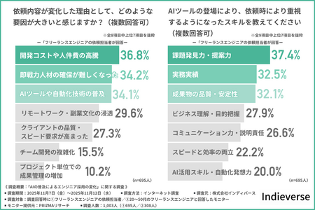 依頼担当者が、依頼時により重視するようになったスキルとして『課題発見力・提案力』や『実務実績』『成果物の品質・安定性』が上位になった点を踏まえると、AIの普及により単なる技術力だけでなく、問題解決力や業務遂行能力が求められているといえるでしょう。