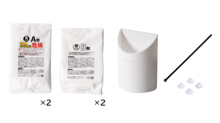<風呂釜パイプバスターZ>A剤2袋、B剤2袋、洗浄カップ、吸盤4個、かき混ぜ棒