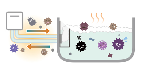酸性のA剤が水垢やサビに、アルカリ性のB剤が皮脂などの汚れや雑菌に作用し、特製のシリコン製容器「洗浄カップ」を使用することで、洗浄剤の高い濃度を維持し、一般的な追いだき配管洗浄剤よりも効率的に汚れを落とすことができます。