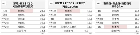 ここから県民性を導くと、熊本県民は耐震性や防犯性も考慮しつつスッキリした空間づくりで住まいの快適性を高め、健康増進と同時に省エネやコスト意識も高いしっかりさん。香川県民は老朽化がきっかけのリフォームでも、住まいの快適性を高めたいアップサイクリスト、そんな側面が見えてきました。