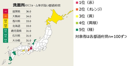 ユニットバスまわりは滋賀県の他大阪府、高知県、鹿児島県が上位で、これらの府県は夏の暑さや湿気が強く、台風や豪雨が多く激しい気候。なので古くから温泉・お風呂文化、癒やし文化が根付き、「一日の疲れを癒やすバスタイムこそ自分や家族へのご褒美」と考える人が多いようです。