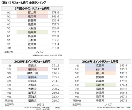 直近5年間のリフォーム費用を都道府県別に見ると、ポイントリフォームは「富山県」(378.6万円)、「福岡県」(341.6万円)の順、2025年の1年間のポイントリフォームは「奈良県」 (351.3万円)、「福岡県」(248.1万円)、「神奈川県」(246.4万円)の順、2026年のポイントリフォーム予算は「広島県」(193.4万円)、「石川県」(193.3万円)、「富山県」(192.2万円)の順でした[図14]。