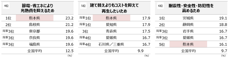 ここから県民性を導くと、熊本県民は耐震性や防犯性も考慮しつつスッキリした空間づくりで住まいの快適性を高め、健康増進と同時に省エネやコスト意識も高いしっかりさん。香川県民は老朽化がきっかけのリフォームでも、住まいの快適性を高めたいアップサイクリスト、そんな側面が見えてきました。