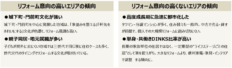 一方、大都市や賃貸率が高い地域は、飲食・娯楽・仕事は外で完結できることから、家を「住み替え前提の暫定的な場所」と見る傾向があり、「住み替えによる最適化」に意識が向きがちです。転勤・転居が前提のキャリアパスで、家は寝る・着替えるための拠点という側面が強く、住まいは長く暮らすというよりも、家具・家電の入れ替えや住み替えで対応する傾向があります。