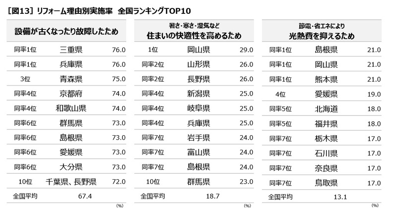 2021年〜2025年の5年間にリフォームした理由(図2参照)別に都道府県をランキングすると、「設備が古くなったり故障したため」(全国平均67.4%)にリフォームした人が多いのは、「三重県」「兵庫県」(同率76.0%)、「青森県」(75.0%)。「暑さ・寒さ・湿気など住まいの快適性を高めるため」(全国平均18.7%)は、「岡山県」(29.0%)、「山形県」「長野県」(同率26.0%)、「節電・省エネにより光熱費を抑えるため」(全国平均13.1%)は、「島根県」「岡山県」「熊本県」(同率21.0%)に多くなっています。「断熱・換気・空気環境など健康を意識した住まいにしたいから」(全国平均10.7%)は、「新潟県」(20.0%)、「富山県」「奈良県」(同率17.0%)、「耐震性・安全性・防犯性を高めるため」(全国平均7.8%)は、「福井県」(12.0%)、「群馬県」「富山県」「石川県」「大阪府」(同率11.0%)に多くなっています[図13]。