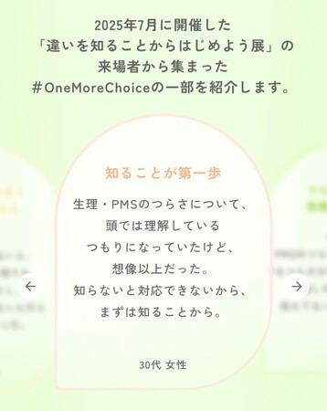 「 わたしの# OneMoreChoice 」のコーナーでは、タレントや医師、 7 月に開催した企画展で来場者から寄せられた「我慢に代わる選択肢= OneMoreChoice 」を掲載しています。また、 SNS に“あなたの #OneMoreChoice” をシェアできる機能を用意しています。それぞれのメッセージを見たり、自分の考えをシェアしたりすることで、自分や周囲の誰かが「隠れ我慢」しないための選択肢が広がるきっかけになることを目指すコンテンツとなっています。(チャプター 4 「向き合う」)