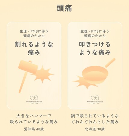 2「気づく」:周囲に見えにくい本音やつらさを、音声やマンガで可視化 3「想像する」:生理・PMSに伴う症状で“いつも通り”にいかない1日やホルモンの周期とともに変化する“こころの波”を可視化 4「向き合う」:来場者が自分にあった選択肢を考えるヒントとなるような、一人ひとり違う “我慢に代わる選択肢=OneMoreChoice”を紹介 |