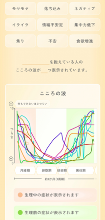 「こころの波」は、生理周期(約1カ月程度)の中で、ホルモンの変動によって生じ、自分ではコントロールしづらい精神的な症状の変化を“波”として表現したコンテンツです。アンケートにご協力いただいた10名の方の症状とエピソードを基に制作しており、生理・PMSにおける精神的症状によるつらさや期間にも個人差があることを示しています。