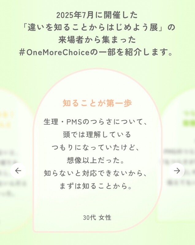 本Web展示では、2025年7月に東京・丸の内で開催した、生理・PMSをテーマとした企画展『違いを知ることからはじめよう展』※1の展示内容をWebコンテンツとして公開します。