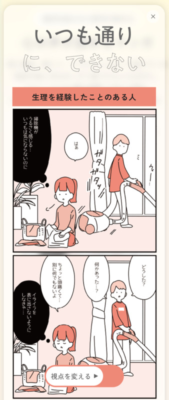 人それぞれ異なる生理・PMSに伴う症状や、その症状による日常への影響を、つらさを抱える人の実際の声を基に可視化したコンテンツです。起床や身支度、外出など、1日のさまざまなシーンに当てはめながら、「“いつも通り”にいかない1日」をCGイラストで表現しています。また、産婦人科専門医からの解説も掲載することで、症状を分かりやすく理解できるような構成にしています。つらさを抱えている人だけでなく、それぞれの症状の経験がない人にとっても、経験していないからこそ想像しづらい症状や、それによるつらさ、影響について、目で見て理解を深められる内容になっています。(チャプター3「想像する」)