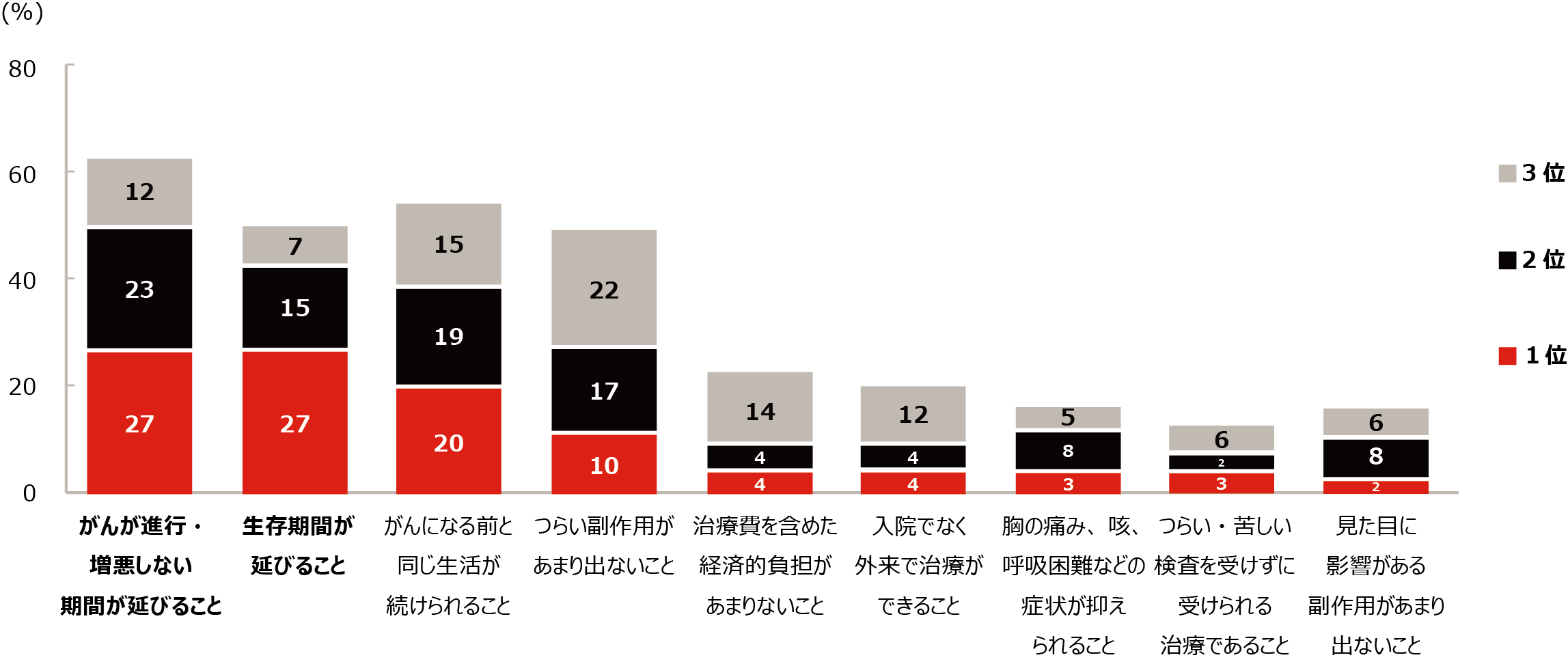 1位で最も多かったのは「がんが進行・増悪しない期間が延びること」と「生存期間が延びること」でいずれも27%でした。