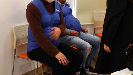 妊娠8~9か月の重さを再現したジャケットを着用し、足元の見えにくさや立ち座りのしづらさを体験。実際にジャケットを着用し、 マットに寝転がってみた参加者は、思うように動けないことに驚いていました。