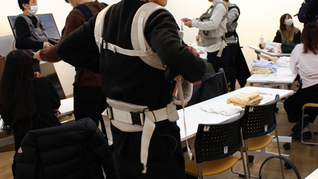 抱っこ紐の種類や選び方の説明。実際の試着ではスタッフと確認し合いながら使い方をしっかり学ばれていました。
