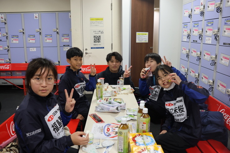 会場では、試合前後でのエネルギー補給用に、全農ブランド商品などを提供する「もぐもぐブース」を設置。ニッポンエール商品や農協シリーズを始め、本会が原料供給している「赤飯おこわ」、「豆腐スイーツバー」や飲料などを揃えました。前日のスポーツ栄養教室でも講義した、試合前後におすすめの食材に関するチラシを掲出し、それを参考に選手は食材を選んでいました。