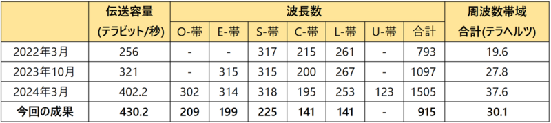 表1 今回と過去の広帯域WDM伝送実験との比較