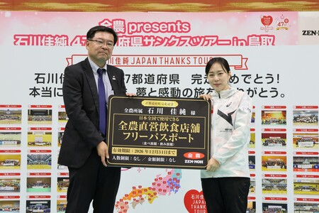 主催者の全農は、感謝の気持ちを込めて「全農直営飲食店舗フリーパスポート」を贈呈しました。このパスポートは、全国にある全農直営の飲食店38店舗で利用できる金額・人数制限なしの食べ放題パスポートです。過去、世界卓球などの国際大会での活躍を祝して、全農直営の焼肉レストラン「ぴゅあ」のフリーパスポートをお贈りしていました。今回はさらに対象店舗を拡大し、焼肉以外の直営店舗でも利用可能なパスポートとなっています。