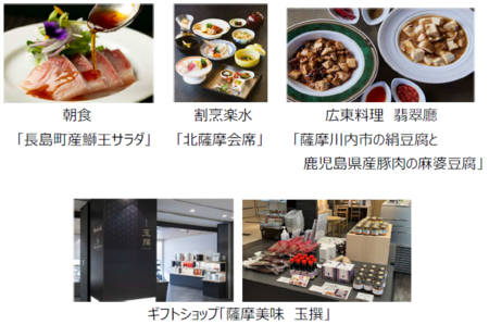 期間中はホテル内の朝食会場・和洋中の各レストラン(店舗指定)にて、それぞれ料理長が現地視察を行い厳選した同じ食材を、異なる調理方法で提供いたします。素材の新しい魅力をぜひご堪能ください。また、お手土産としてギフトショップに北薩摩の特産品をご用意しております。