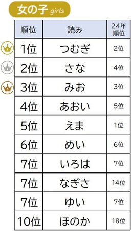 女の子の読みでは、「つむぎ」が昨年の2位から1位へランクアップしました。