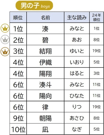 2025年 名前ランキングでは、男の子「湊」(みなと)、女の子「翠」(すい)が1位を獲得しました。