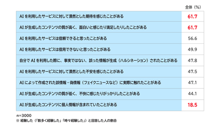 ①AI利用に伴う経験について、「AIを利用したサービスに対して漠然とした期待を感じたことがある」「AIが生成したコンテンツの質が高く、面白いと感じたり満足したりしたことがある」人は、ともに約6割(61.7%)。
