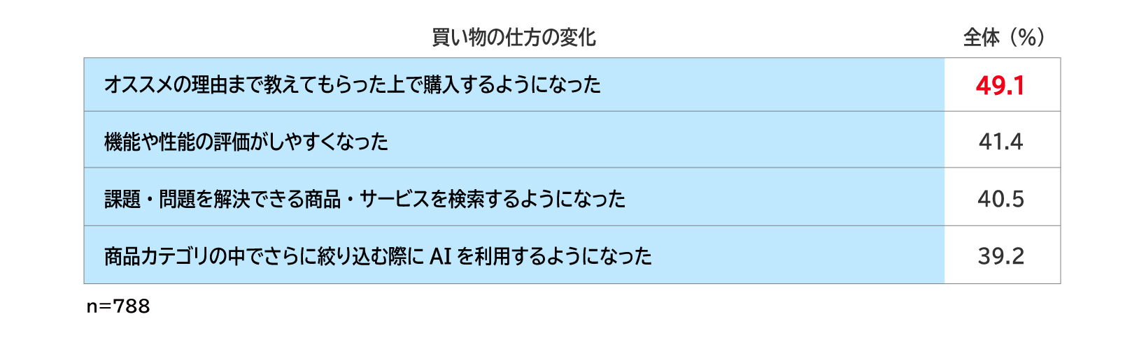 ・AIを利用する前と比べた買い物の仕方の変化について、最も多い変化は「オススメの理由まで教えてもらった上で購入するようになった」(49.1%)。【図表6】