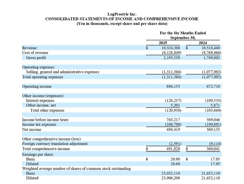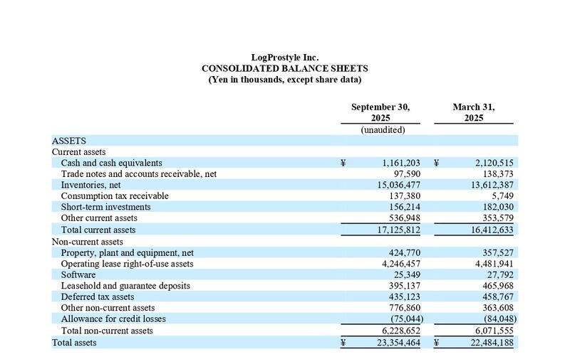 株式会社LogProstyle(NYSE American: LGPS、本社:東京都港区、代表取締役 兼 執行役員社長:野澤泰之、以下「当社」)は本日、2026年3月期上期(2025年4月1日~2025年9月30日)における決算を発表いたしました。