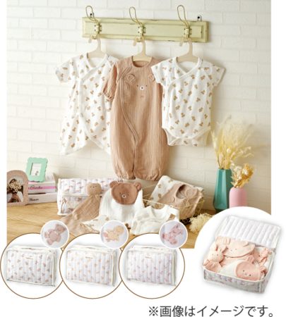 ・ 短肌着(半袖)×1 ・ コンビ肌着(七分袖) ×1 ・ ロンパース(半袖) ×1 ・ ドレスオール(長袖) ×1 ・ 帽子 ×1 ・ ぬいぐるみ付ソックス ×1 ・ ガーゼハンカチ ×3 ・ 巾着 ×1 |