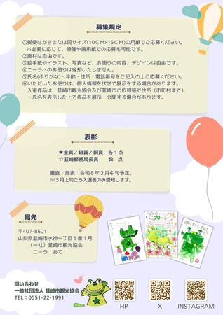 いただいた作品は、個人情報を伏せたうえで展示される場合があります。また、入選作品については、韮崎市観光協会や韮崎市の広報などで、住所(市町村まで)・氏名を表示したうえで展示・公開される場合があります。