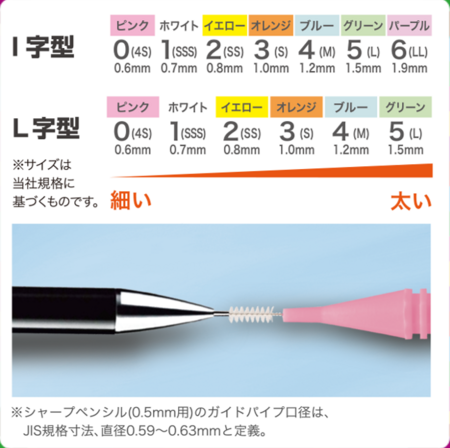 歯間の状態に合わせて選べるように、サイズ0~6の全7サイズをラインアップ。中でも最小のサイズ0は最小通過径0.6mmを実現。シャープペンシルの先端よりも細い極細設計で、狭い歯間部にも無理なく通すことができます。