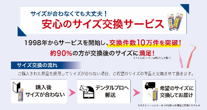 使用時にサイズが合わなかった場合でも、希望のサイズに交換できる「サイズ交換サービス」をご用意。初めて歯間ブラシを選ぶ方でも、安心して自分に合うサイズを見つけられるサポート体制を整えています。1998年に開始した同サービスは、2024年に累計利用数10万件を達成しました。