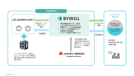 事業化フェーズにおいては、JA三井リースによる「ファイナンス機能(リース等)」を活用したヒートポンプ導入スキーム、バイウィルによる「J-クレジットの創出・販売」、農家への還元までを一体化したワンストップモデルを構築し、全国へ展開します。これにより、初期投資のハードルにより省エネ効率の高いヒートポンプ導入を断念していた農家へ機会を提供し、コスト削減と生産性向上による「持続可能な農業経営」を通じて、地域産業である農業のさらなる発展と「地域脱炭素」の実現に貢献してまいります。