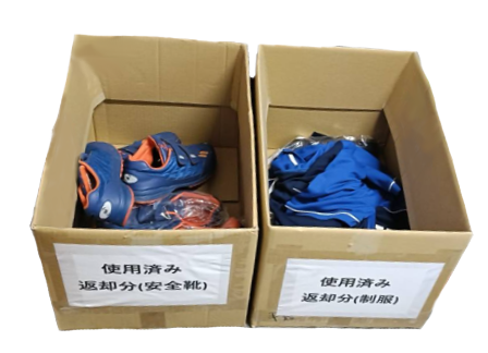 クリーニング済みリユース制服 使用済みユニフォームと安全靴の回収箱