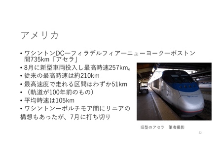 ・アメリカ(北東回廊 ワシントンDC―ボストン):インフラの老朽化により平均時速は150km程度。その他の計画においても、連邦政府による補助金の打ち切りなどの影響多数