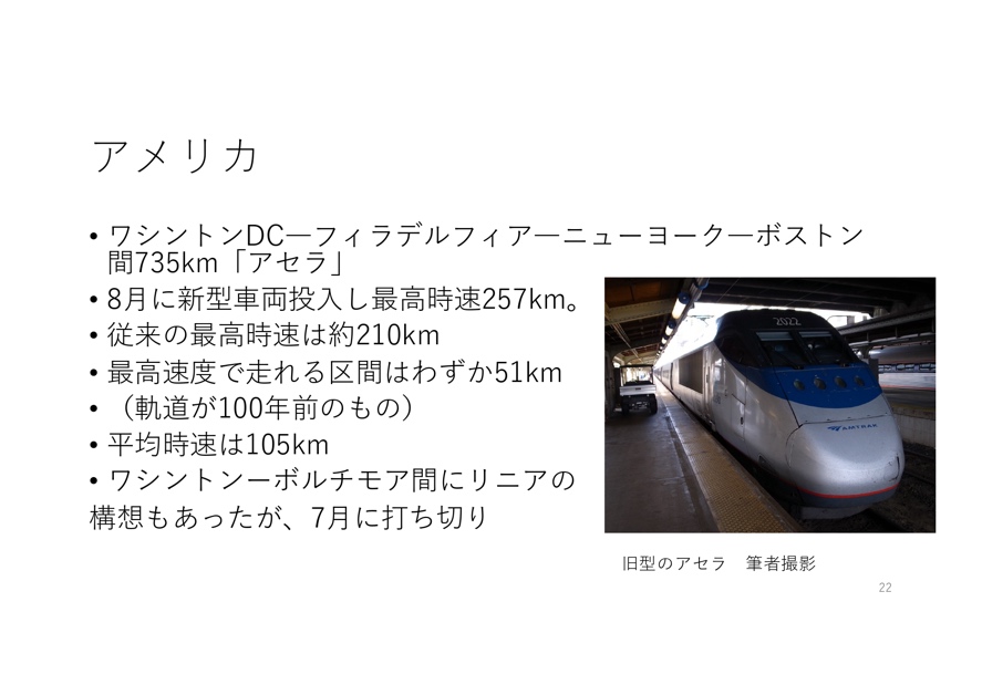 ・アメリカ(北東回廊 ワシントンDC―ボストン):インフラの老朽化により平均時速は150km程度。その他の計画においても、連邦政府による補助金の打ち切りなどの影響多数