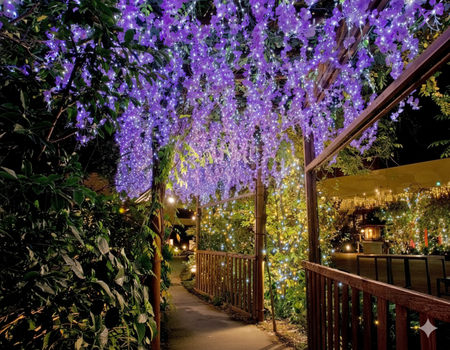 振袖やスーツ姿が一層映える、幻想的な光の演出。66,666球のイルミネーションがきらめく「光の庭園」で、成人の記念にふさわしい“とっておきの一枚”を撮影いただけます。当館ならではの和の情緒と光のコラボレーションが、特別な一日をより華やかに彩ります。