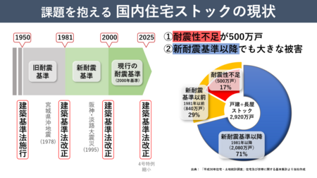 2025年は、阪神・淡路大震災の発生から30年となる年でした。皆さんもご承知の通り、日本はその地理的条件から、世界的にみても有数の地震大国といわれています。今後、南海トラフ地震や首都直下型地震など、巨大地震の発生が高い確率で想定されています。住宅建築に関しては、大地震が発生する度に耐震基準が見直されてきました。現在適用されているのは、1981年に制定された新耐震基準です。2000年の阪神淡路大震災を受けて一部強化されていますが、国内には未だ、新耐震基準以前の住宅ストックが約29%あり、そのうち耐震性不足とされる住戸は約500万戸あるとされ、この対策は急務です。